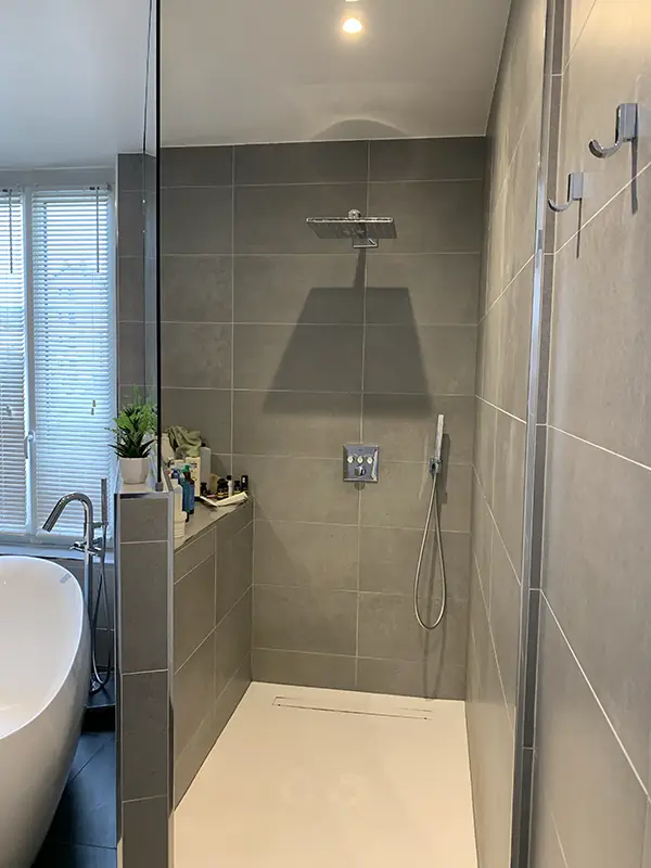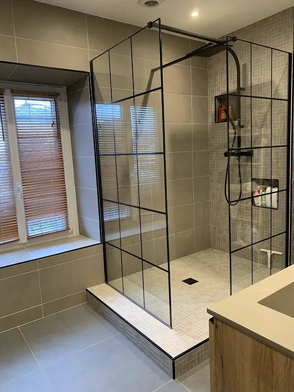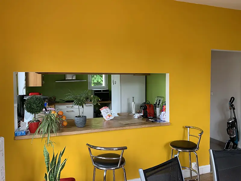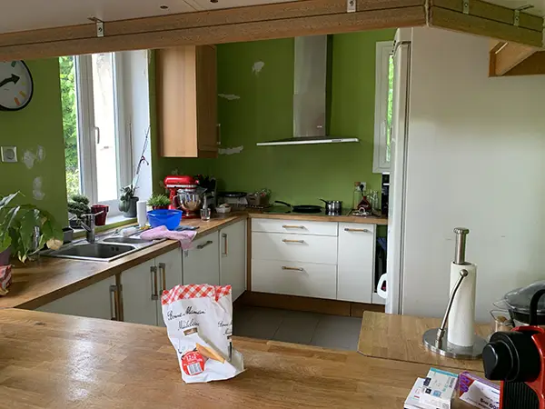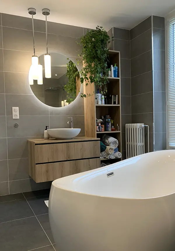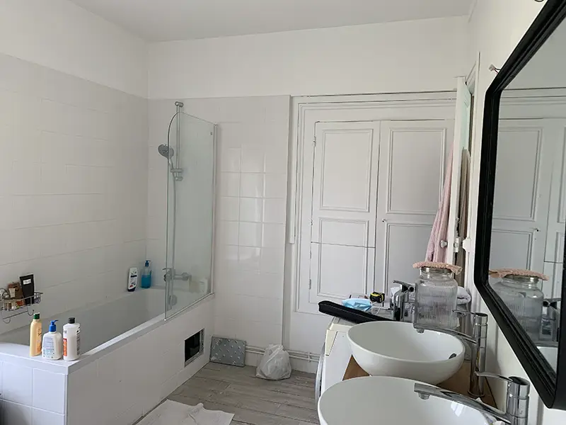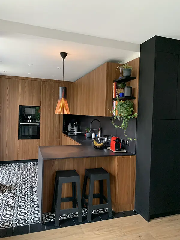On peut avoir un coup de cœur pour une maison sans pour autant en apprécier la déco existante. Bien trop colorée au goût des clients, ce projet leur a permis de vraiment s’approprier cette belle demeure. Changement radical pour une cuisine ouverte en placage bois, Fenix noir et carrelage effet carreaux de ciment. Les deux salles de bain ont également été entièrement rénovées dans des tons neutres avec à chaque fois un peu de tons bois pour apporter un peu de chaleur.