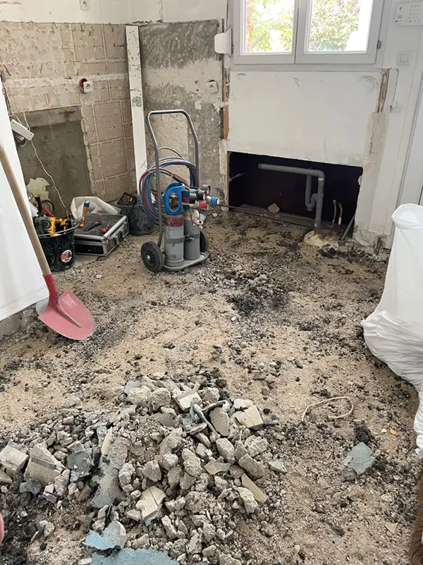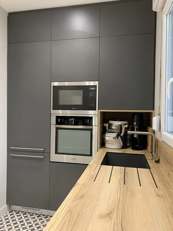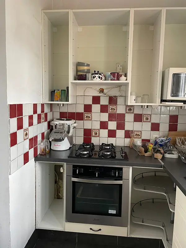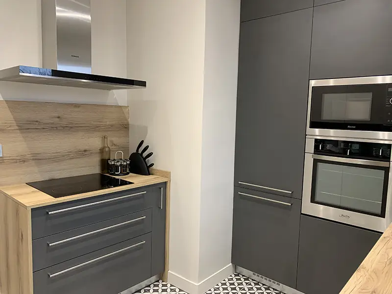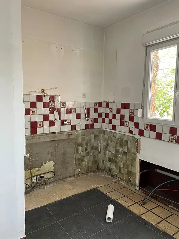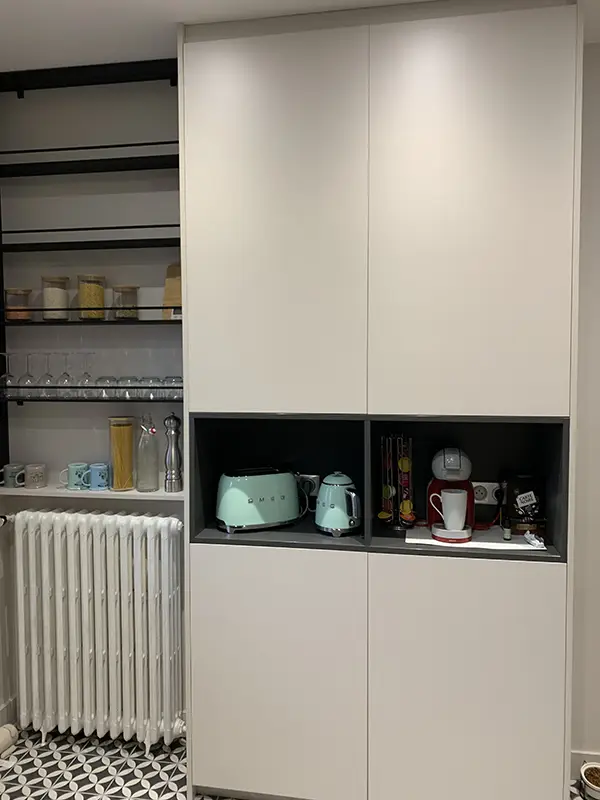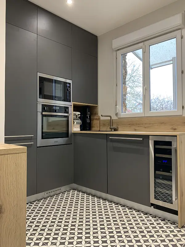 Nouvelle cuisine dans une meulière avec un carrelage effet carreaux de ciment prolongé dans toute l’entrée pour rester en adéquation avec le style de la maison et les goûts des clients. La pièce étant de petite taille, de grandes colonnes allant jusqu’au plafond permettent un maximum de rangement.