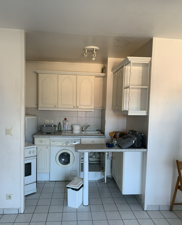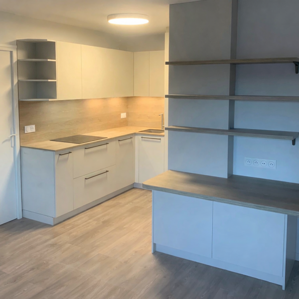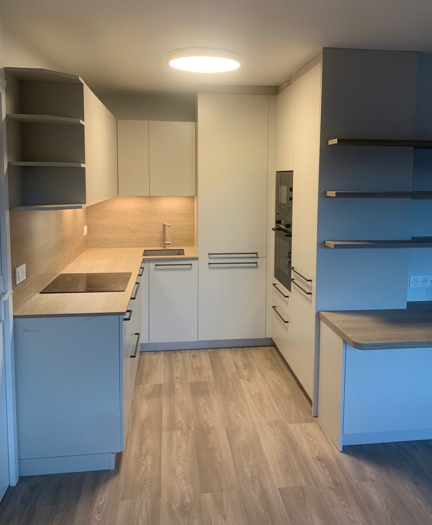Changement de sol dans tout l’appartement et nouvelle cuisine avec un petit coin repas dans le séjour.