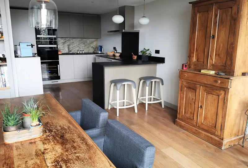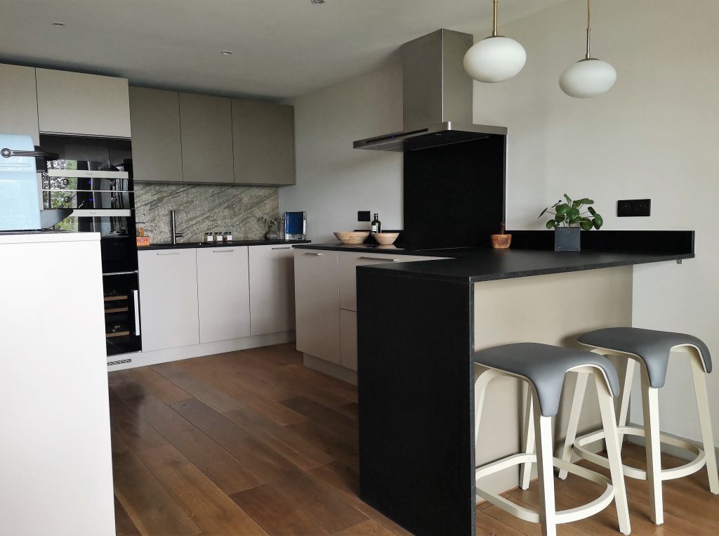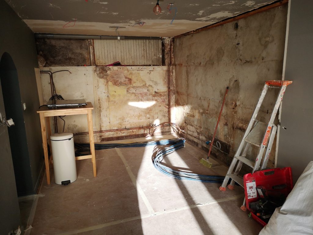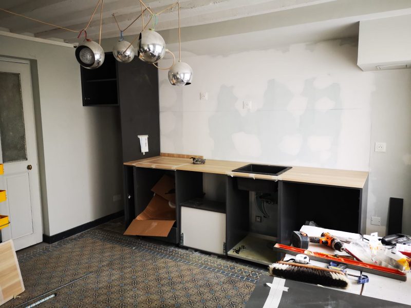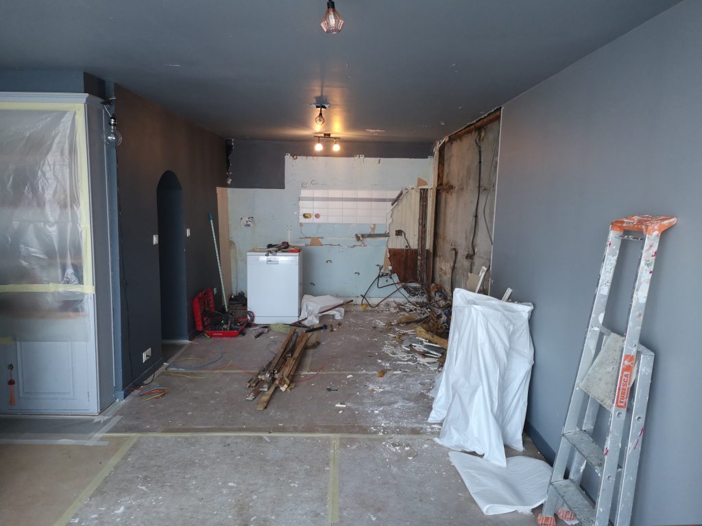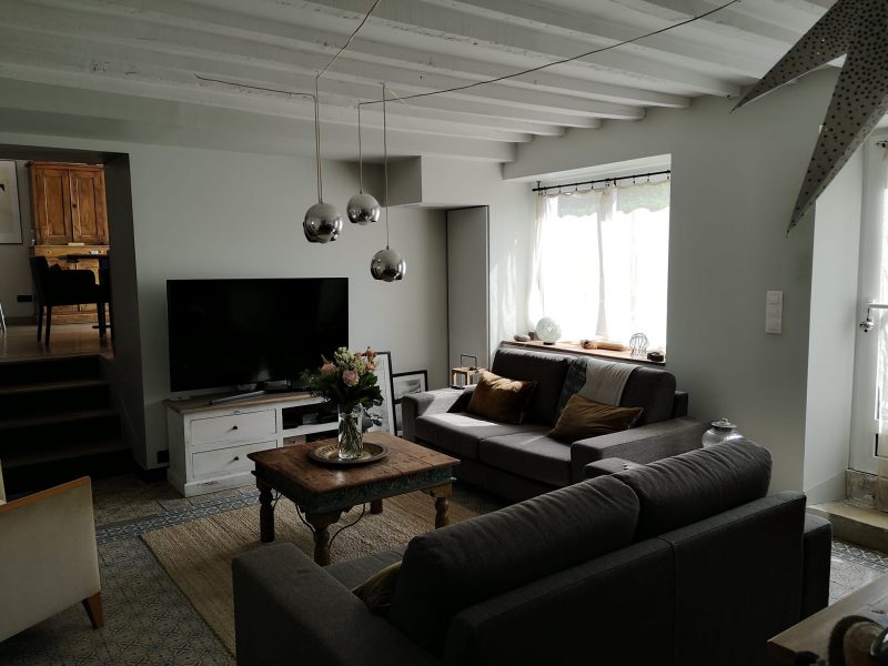 La maison a été divisée en deux logements distincts. Dans le logement principal, une nouvelle cuisine a été installée et l’accès au séjour en contrebas a été fermé permettant d’isoler le deuxième logement. Le mur de séparation a permis d’accueillir une cuisine dans celui-ci.