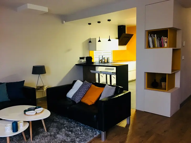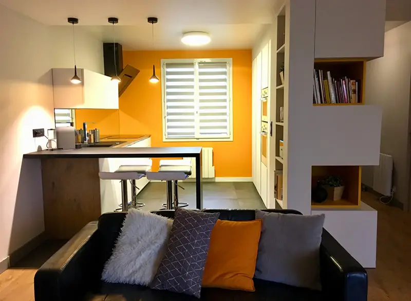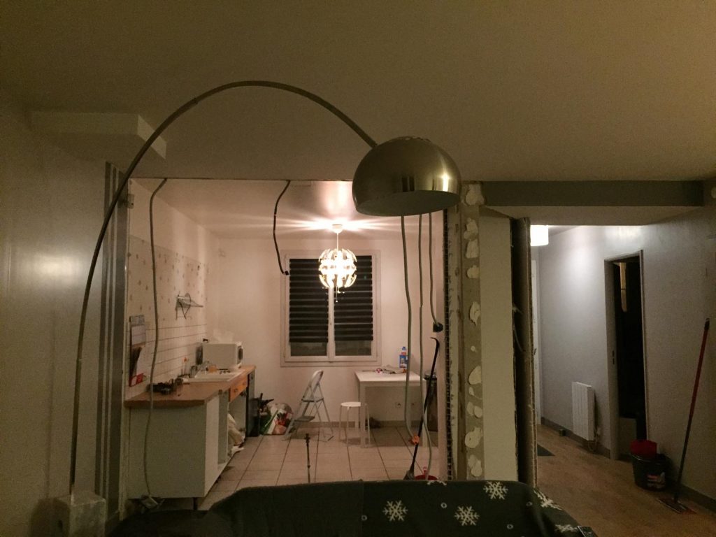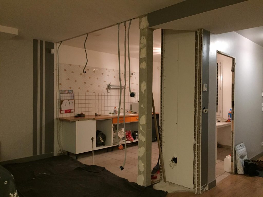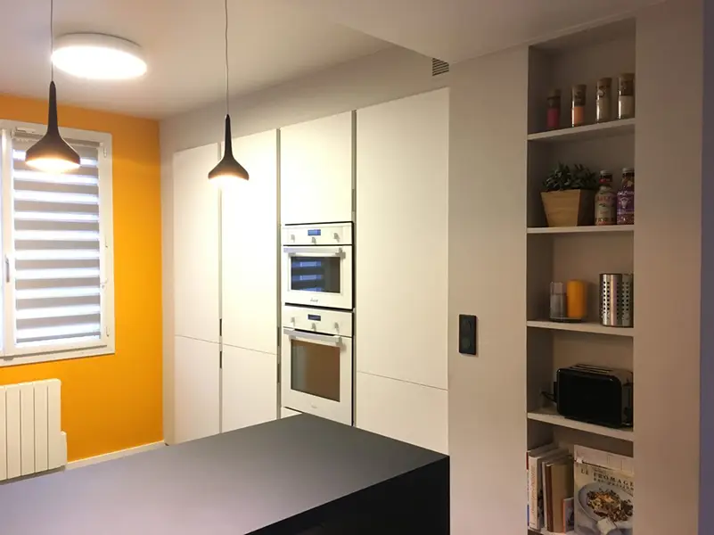 La cuisine était fermée par une cloison non porteuse qui a été supprimée. L’ensemble a été conçu de manière à conserver une fermeture côté couloir et à cacher un poteau porteur en aménageant autour des rangements sur mesure afin qu’il se fonde dans l’ensemble.