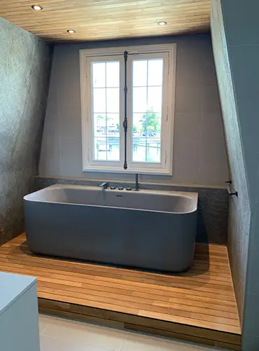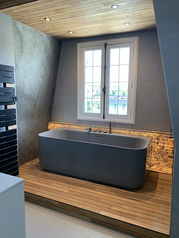 Un soubassement et un faux-plafond recouverts de teck pont de bateau a été créé afin de pouvoir placer les évacuations de la baignoire semi-îlot et des spots encastrables. Des feuilles de pierre ont été posées sur les façades obliques ainsi qu’à l’arrière de la baignoire en version transparente avec un éclairage indirect.