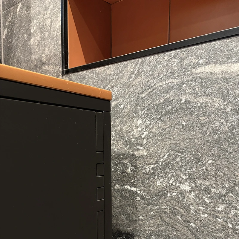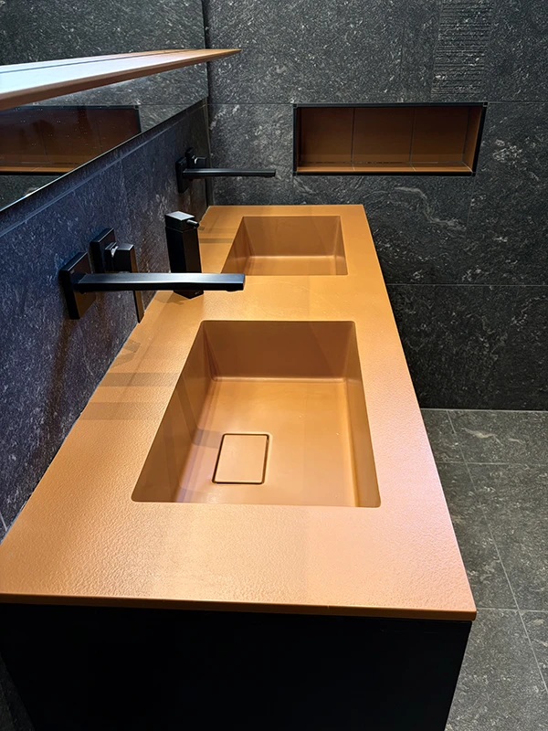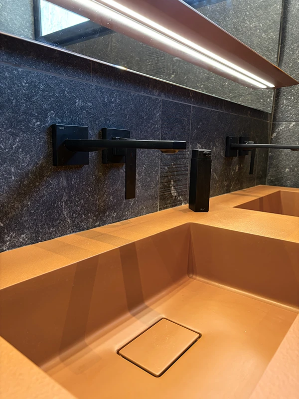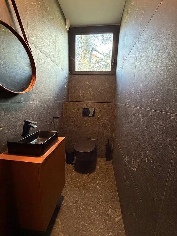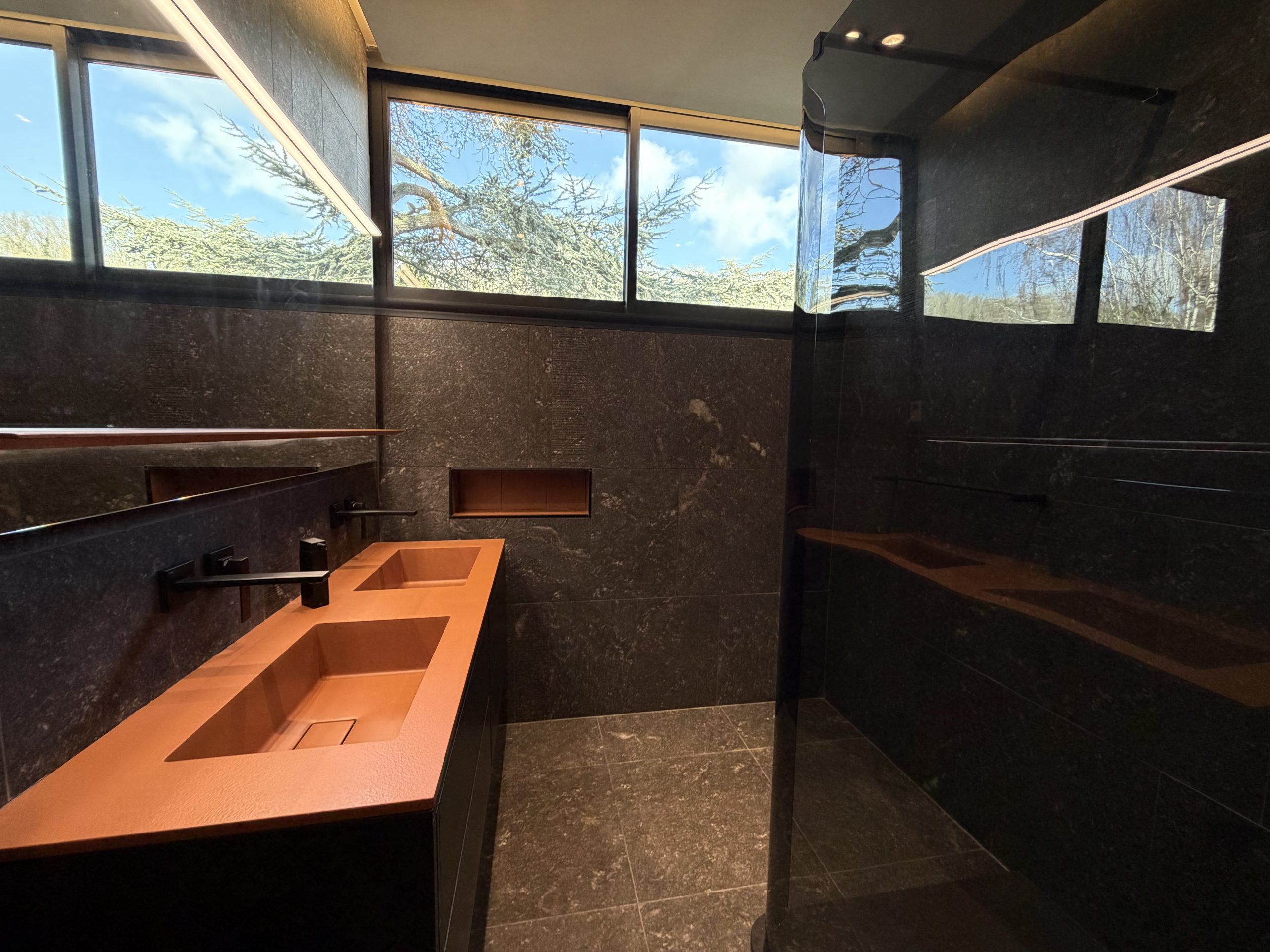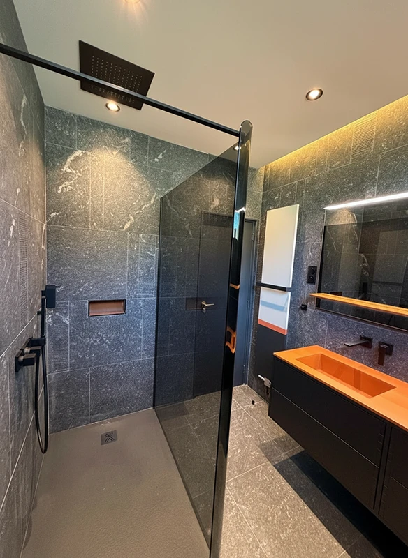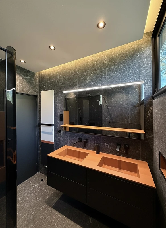Relooking total d’une salle d’eau et de son wc attenant afin qu’ils s’harmonisent avec le style résolument contemporain de la maison. La porte située entre les deux pièces a été condamnée, permettant d’accueillir un grand meuble avec deux vasques intégrées. Le choix d’un carrelage très foncé a permis de créer un fort contraste avec la couleur préférée du client (tons orangés).