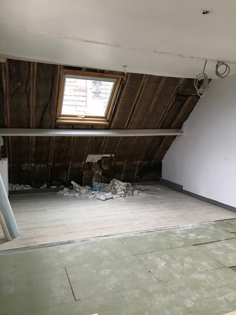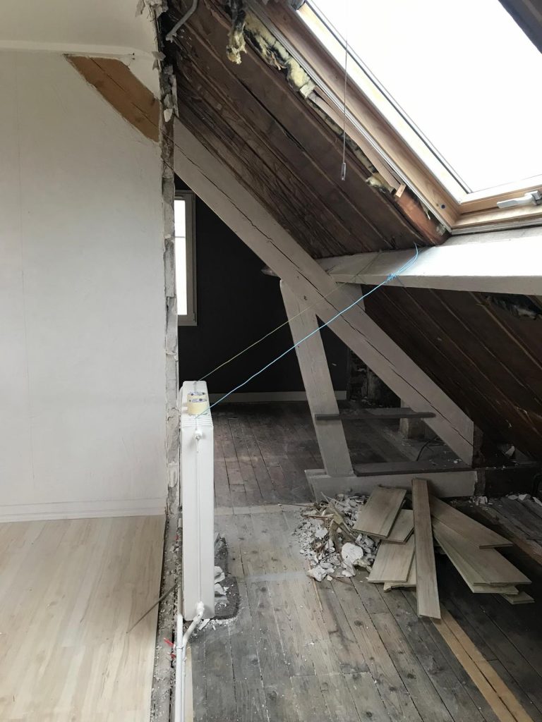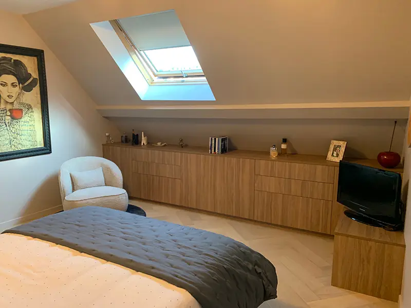 Un bureau et une petite chambre ont été rassemblés afin de créer une grande suite parentale. Certaines cloisons ont été supprimées et de nouvelles ont été installées afin de délimiter la chambre et d’inclure un dressing ouvert dans un renfoncement. Les murs d’enceinte ont été doublés afin d’apporter une meilleure isolation thermique.